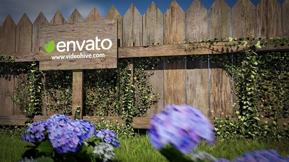 Backyard house. In front of the yard fence there is a wooden sign with a logo or slogan of your choice. Beautiful yard with flowers. A great logo mockup. The project includes a choice between two materials of yard fence as well as all the necessary settings in the control panel. You can use this project for professional look logo, reveal, intro, opener for garden show, flower TV shows, flower vlogger shows, architectural projects, real estate sales and more business projects.